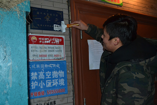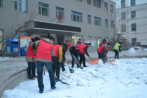 首先,于佳主任为志愿者进行了简单的任务介绍和分配,志愿者们分为两队,一队由于佳带领,进行积雪的清扫;另一队由胡佳带领,对社区内的小广告进行清理。其中,在清理水池内的积雪时,于主任告诉我们:“这里平时会有社区里的小孩子玩耍,十分的危险,这次你们帮助居委会清理干净,以后小孩子就不会来了。”清理时志愿者们分工合作,一组负责将积雪铲松,另一组将雪堆到指定地方。天色将晚,天气寒冷,然而志愿者的热情不减,同学们都干得热火朝天,将积雪清理干净。清理小广告的队伍则穿行在社区中,认真仔细的寻找和清理每一处广告。