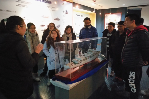 下午三点,122班全体成员在船舶博物馆门前集合完毕,团支书与预约的船舶讲解员取的联系,由她为我们这次参观做讲解。首先讲解员为我们照了一张集体照,随后讲解员带着我们参观各式各样的船舶,其中有古代时期的沙船,舟船还有郑和下西洋时的战船等,当然也有近代的帆船,有传奇色彩的至远舰,定远号。在讲解员的详细讲解下,我们学习了关于我校的特色“三海一核”办学理念,更知道了我校在中国船舶以及核事业上做出的突出贡献,我校自主研制的“万向―Ⅱ”潮流实验电站,还有世界上第一艘气垫登陆实验艇。同时还有我校为航母辽宁号所做出的巨大贡献。下午三点半时,我们集体完成了此次参观。