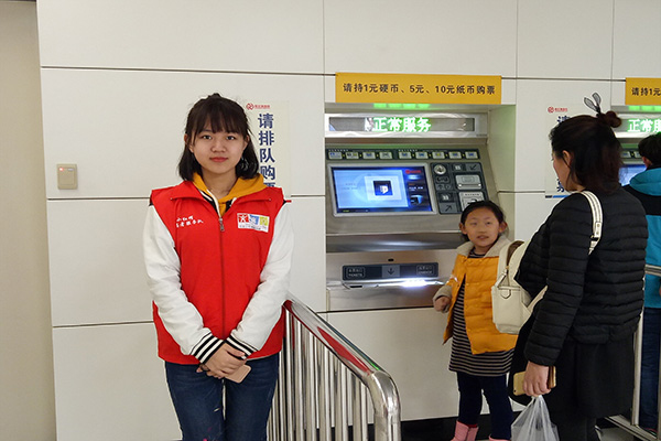 两团支部分别在小红帽公益部副部牛奔和实践部副部彭钰皓带领下准时来到工程大学地铁站,在站长的指示下四位志愿者到达自己的工作岗位。两个人在出站口,为乘客解决卡票的问题。两个人在自助售票处为不会买票的人提供帮助。同时志愿者们负责向不熟悉周围环境的人提供指路的服务。