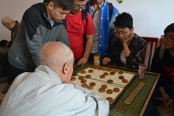 志愿者们到达老年公寓后,团支书王克广先和老年公寓的负责人联系。在活动开始前,王克广为各位志愿者讲解了注意事项。各位志愿者先帮助敬老院擦拭供老人坐的凳子和体育器材。随后,志愿者们去到活动室和老人们亲切交流。在活动室里,有的志愿者走到老人身边坐下和他们聊天,听他们讲过去的故事,我们也把发生在学校的故事讲给老人听;有的志愿者坐下来陪老人下象棋,缓解老人孤独的情绪;还有的志愿者坐在老人身旁,陪老人看电视。14时25分,活动结束,与工作人员合影留念后原路返回学校。