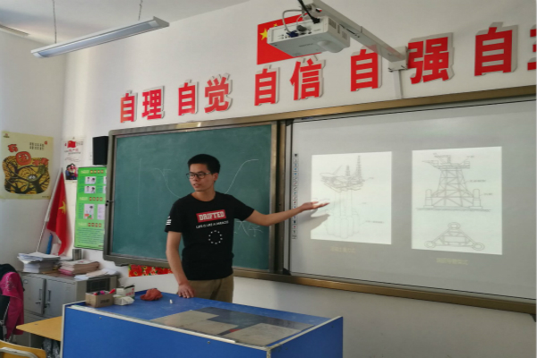 本次讲授的内容是海洋平台,赵志鹏先以一系列海洋平台图片引入,激发同学们的兴趣,并对移动式,固定式平台的具体结构进行详细的讲解,他在讲解的过程中,充分地利用小学生能理解的知识点与他们进行互动。赵志鹏通过指导学生们制作桁架式结构,让同学们在实践制作中更深刻地了解海洋平台的结构。