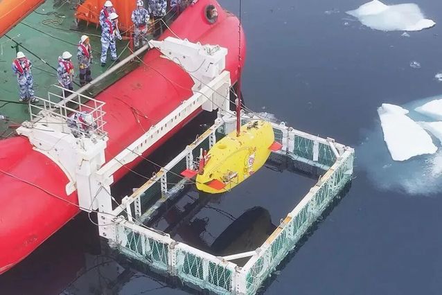2025年8月20日,哈尔滨工程大学船舶工程学院海洋无人航行器技术“兴海”学术团队在高纬度地区布放“悟空6000”自主水下航行器。(张书航 摄)