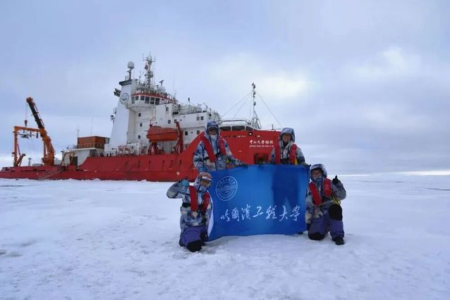 2025年8月24日,哈尔滨工程大学船舶工程学院科考队员在长期冰站合影。(周娟伶 摄)