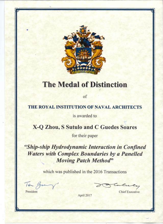 Recently, the Royal Society of Naval Architects announced the winners of the 2017Medal of Distinction. The paper Ship-ship Hydrodynamic Interaction in Confined Water with Complex Boundaries by a Panelled Moving Patch Method collaborated by Associate Professor Zhou Xueqian and Professor S Sutulo and Professor C Guedes Soares of the University of Lisbon's Ship and Ocean Engineering Technology Center was the winner. The paper was published in the international journal Maritime Engineering in 2016.